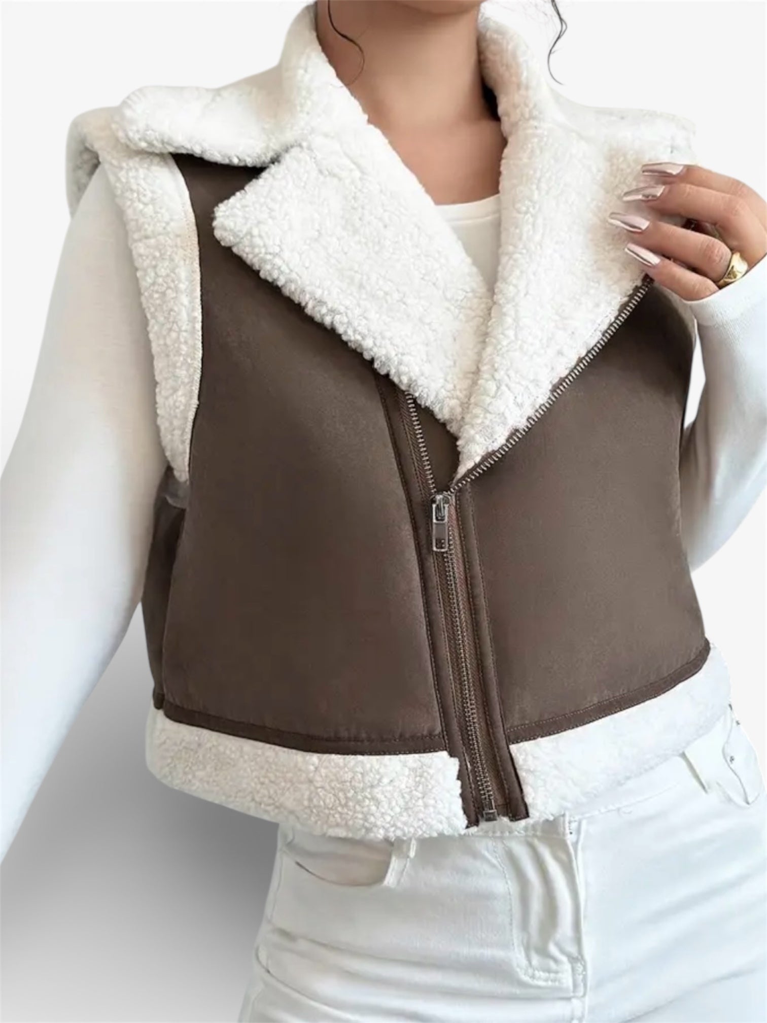 Diseñado para mujeres que buscan sofisticación sin renunciar al confort, este chaleco premium tipo borrego redefine el abrigo ligero con un estilo contemporáneo y atemporal. Su exterior con acabado tipo gamuza aporta una textura suave y refinada, mientras que el interior afelpado efecto borrego envuelve el cuerpo en una sensación cálida y acogedora.