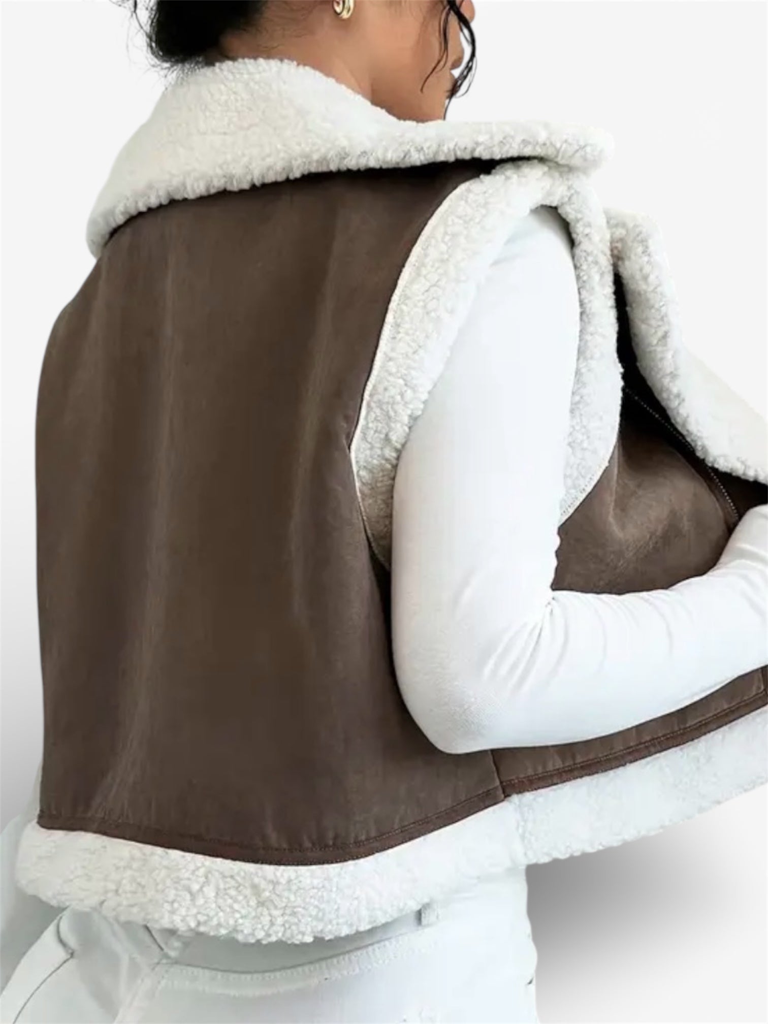 El diseño sin mangas estiliza la silueta y permite combinarlo fácilmente con blusas, sweaters o prendas de punto fino. El cuello amplio con forro borrego añade un toque de lujo discreto, ideal para elevar cualquier look diario a uno más pulido y elegante.
